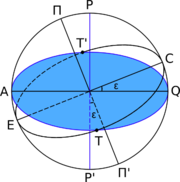 01:46, 27 мая 2022 Небесная сфера.png (файл) 58 Кб Aqui P,P' — полюсы мира, T,T' — точки равноденствия, E,C — точки солнцестояния, П,П' — полюса эклиптики, PP' — ось мира, ПП' — ось эклиптики, ATQT'- небесн… 1